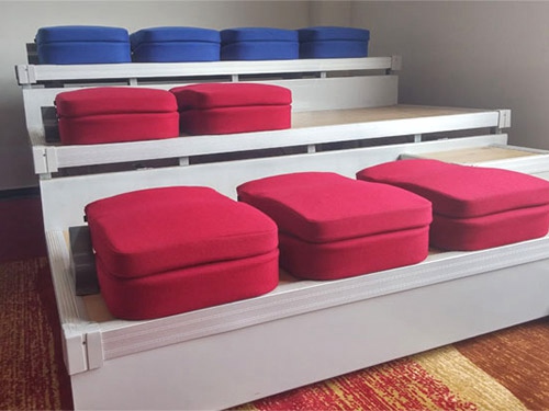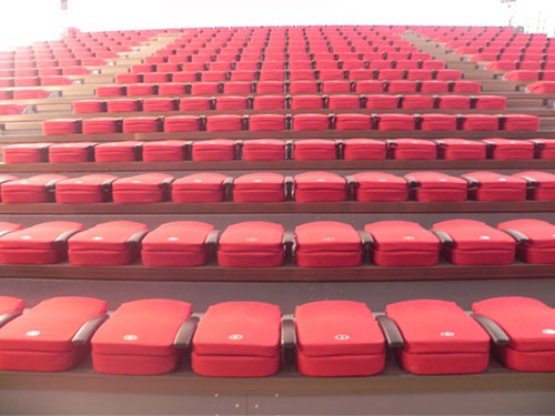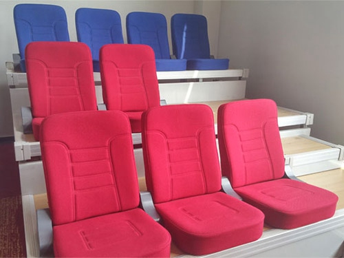 KTR-1型带扶手式伸缩看台椅 背高:52mm、背宽:43mm、座深:44mm、座宽:45mm 1、座椅的背和垫形状和尺寸符合人体工程学原理,内芯材料采用聚氨酯冷发泡定型海绵,使背座频繁使用不变形,不起皱,且拆装方便,高回弹,不变形,面料采用进口毛麻阻燃面料,表面丰满无皱,为全面料包制型,有耐磨,耐脏之特点,舒适、牢固、耐用。 2、扶手立柱采用优质型钢焊接而成,配件采用A级钢板模压成形焊接,座背、坐垫与支架的连接牢固可靠、运动灵活。 3、看台座椅使用手动翻倒,立起机构,立起时能自动锁止。